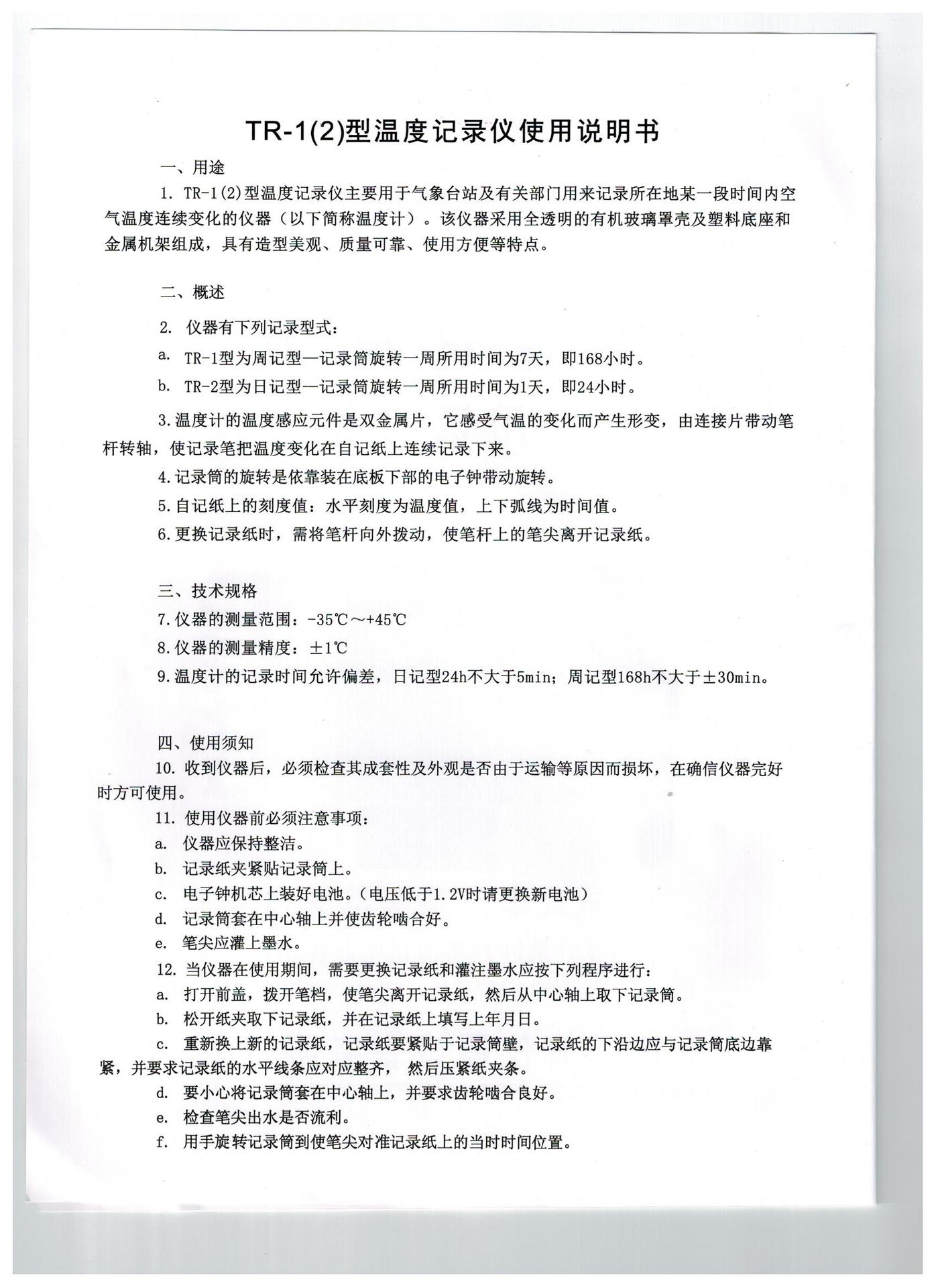 TR12温度记录仪是气象台站及有关部门用了记录所在地某一段时间内空气温度连续变化的仪器。仪器有日记型(记录筒旋转一周为24小时),周记型(记录筒旋转周为7天即168小时),周日两用型(一周记和日记可以切换,如用周记纸,则仪器底座上的时间按钮应按下7,如用日记纸则仪器底座上的时间按钮应按下1), 上海狐狸视频下载APP仪器设备有限公司是专门生产这种仪器的厂家,公司地址:上海市青浦区白鹤正兴利路451号。电话:59219072,联系人曾小姐,17765129546,13764265639.